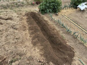 写真のように、まっすぐ長い溝を掘ると作業がしやすくなります。