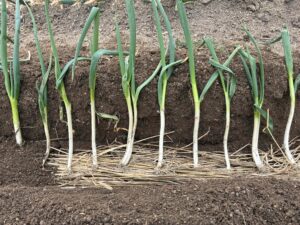 ネギは成長に合わせて土をかぶせていくことで、白い部分(軟白部)が長くなります。