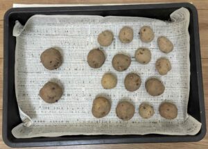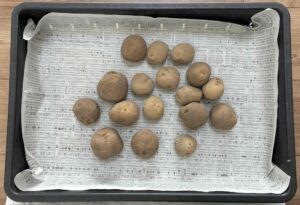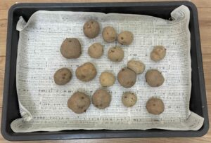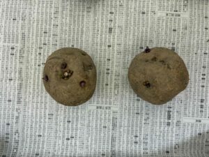 まずは購入した種いもを確認します。芽がまだ短い、またはほとんど出ていない状態からスタートします。