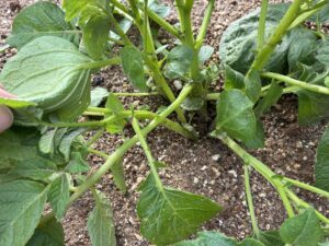 芽が 10cm ほどに伸びたら、1 回目の土寄せをします。 この作業を 2〜3 回繰り返すことで、芋が太りやすくなります。